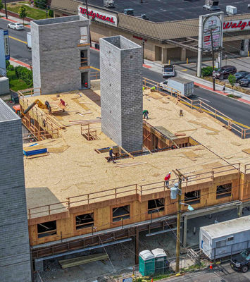 The building is a total of five floors, featuring a unique and robust construction approach on a very condensed urban intersection. The first floor is constructed with a steel podium with poured in place concrete deck designed to support four additional floors of wood framed construction with a flat membrane roof. The façade includes multiple finishes including brick, cast stone, metal and cement panels